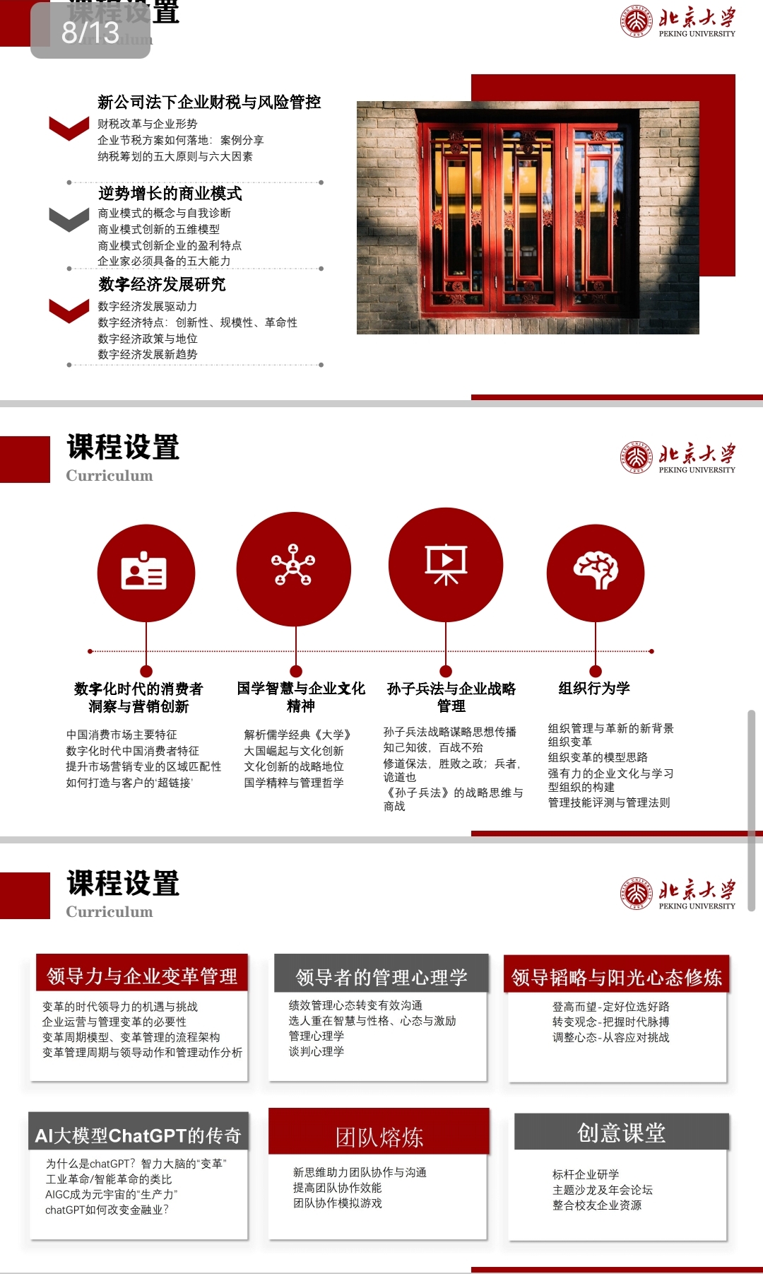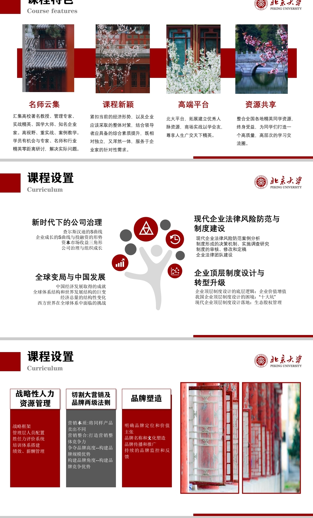 匯集高校著名教授、管理專家、實戰(zhàn)精英、國學(xué)大師、知名企業(yè)家。高視野、重實戰(zhàn)、案例教學(xué)。學(xué)員有機(jī)會與專家、名師和行業(yè)精英零距離研討,解決實際問題。 課程新穎,緊扣當(dāng)前的經(jīng)濟(jì)形勢,以及企業(yè)應(yīng)該采取的整體對策,結(jié)合領(lǐng)導(dǎo)者應(yīng)具備的綜合素質(zhì)提升,既相對獨立,又渾然一體,服務(wù)于企業(yè)家的針對性需求。 北大平臺,拓展建立優(yōu)秀人脈資源,商場實戰(zhàn)以學(xué)會友,尊享人生廣交天下精英。 高端平臺 資源共享整合全國各地精英同學(xué)資源,終身受益,為同學(xué)們打造一個高質(zhì)量,高層次的學(xué)習(xí)交流圈。